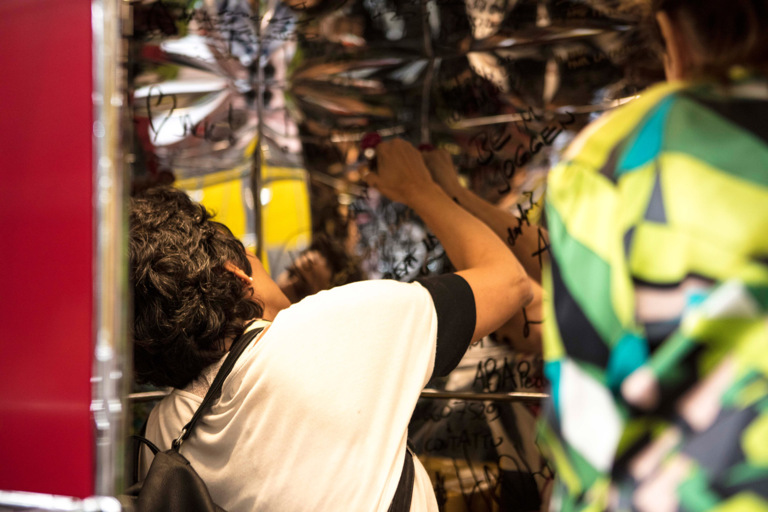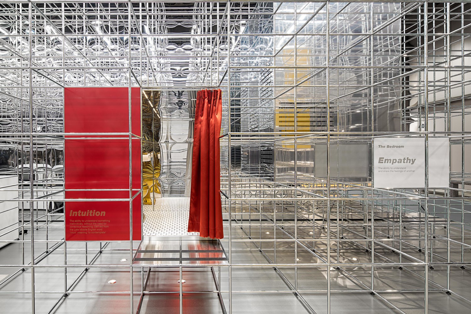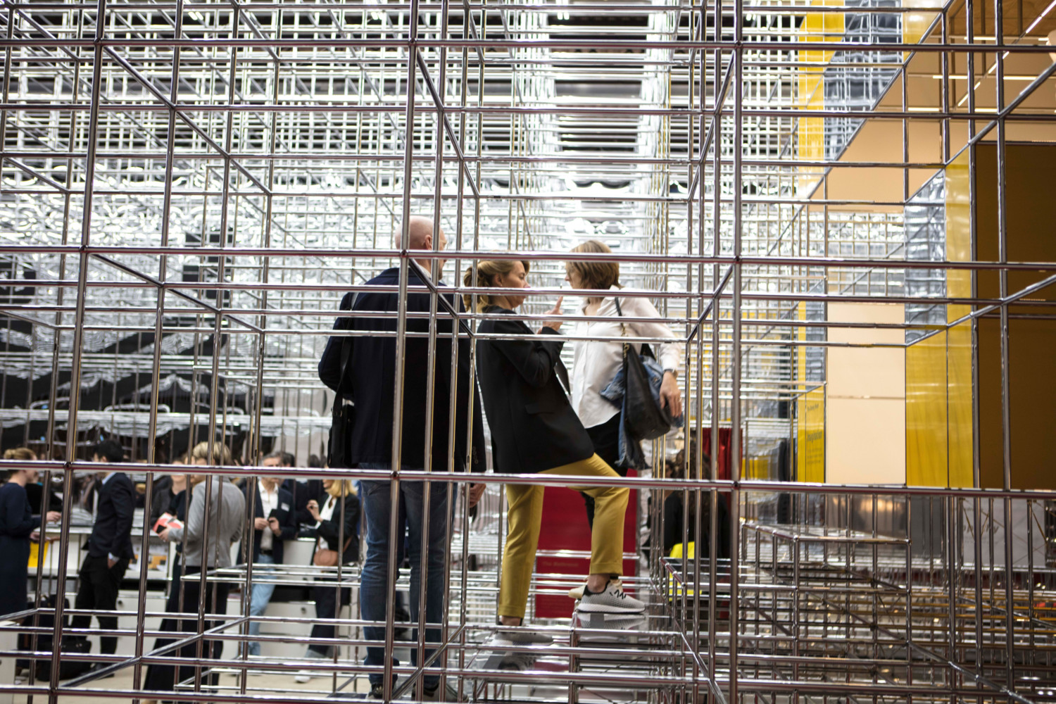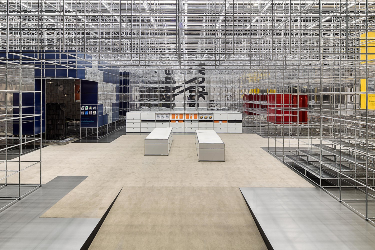 USM enlisted the help of UN Studio who have made full use of the USM Haller furniture system by building a super-structure out of it with four rooms nestled within. Visitors who climb into the rooms are challenged to communicate their thoughts about their work/life.